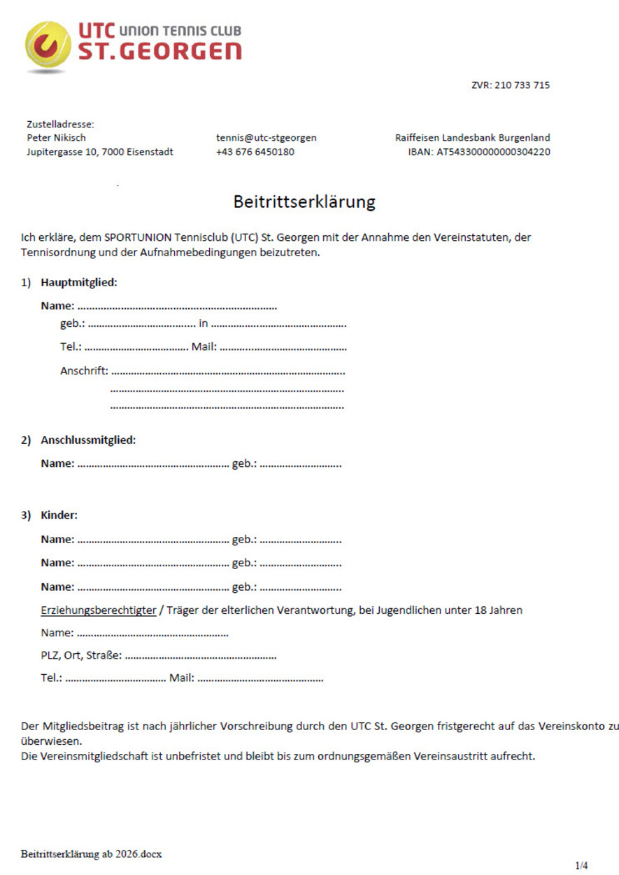 - Fülle die BeitrittserklärungBeitrittserklärung aus und sende diese per E-Mail an >> tennis@utc-stgeorgen.at.